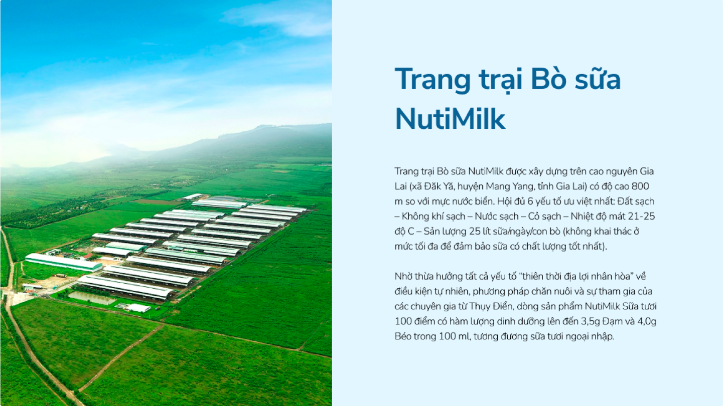 We lead users to explore from pure natural ingredients resource - Nutifood's vast dairy cows field - to the high-tech factories, and global leading research institutes. That's how Nutifood brings out Science-based Solutions from Nutrition Experts to all their customers.